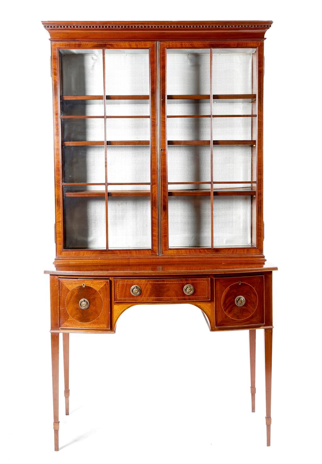 A mahogany display cabinet by Maple & Co. Ltd., inlaid with stringing, with a pair of astragal glazed doors enclosing three adjustable shelves, the bowfront base fitted with three drawers, the central one stamped 'MAPLE & CO LTD', early 20th century, 199cm high, 109.7cm wide, 56cm deep.