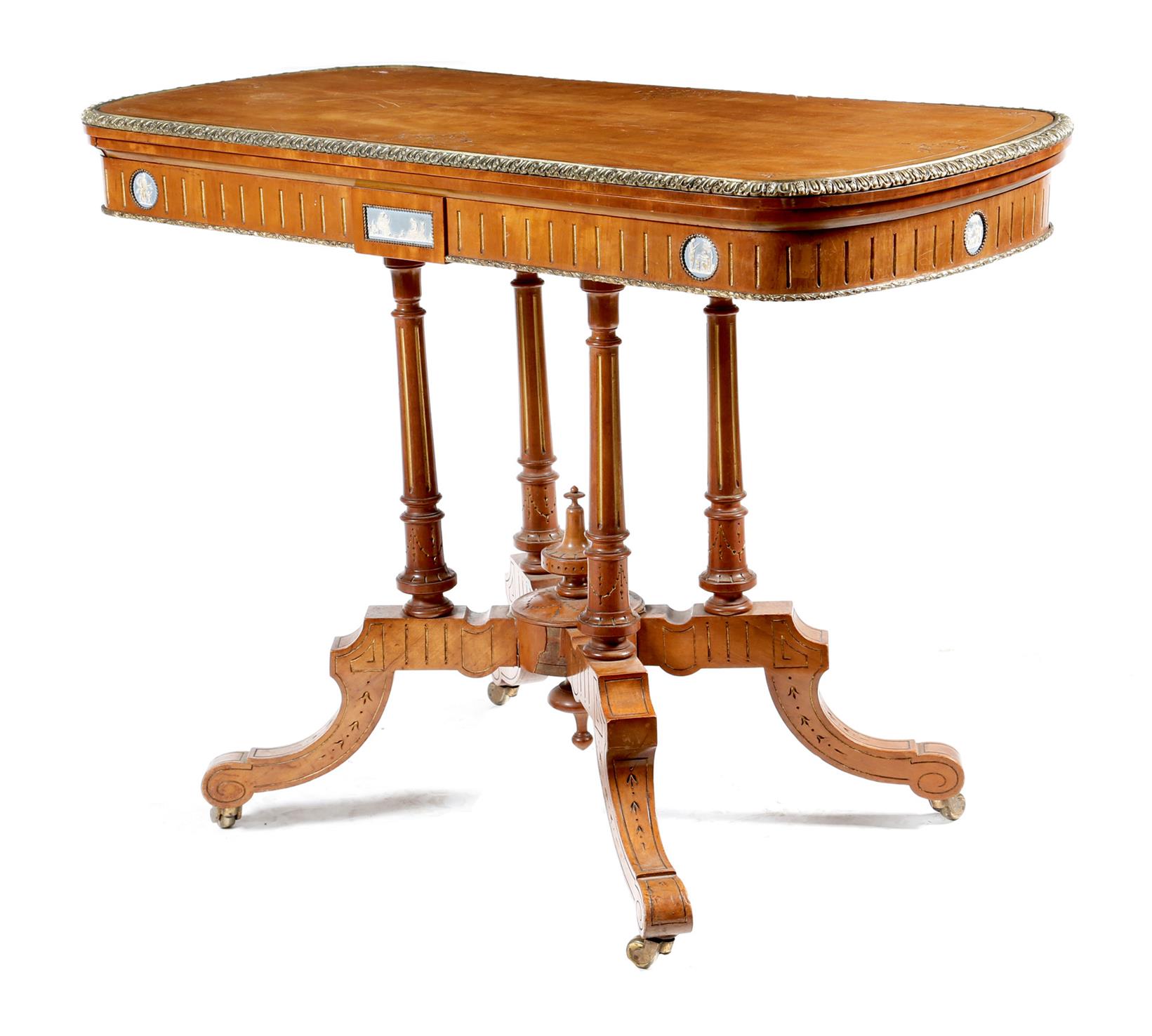 A Victorian satin birch card table, with brass mounts and parcel gilt engraved decoration, the hinged swivel and fold-over top revealing a blue baize playing surface, with a gilt tooled leather border, the fluted frieze decorated with blue and white jasper ware plaques, on four column supports and brass castors, 71.1cm high, 95cm wide, 47cm deep.