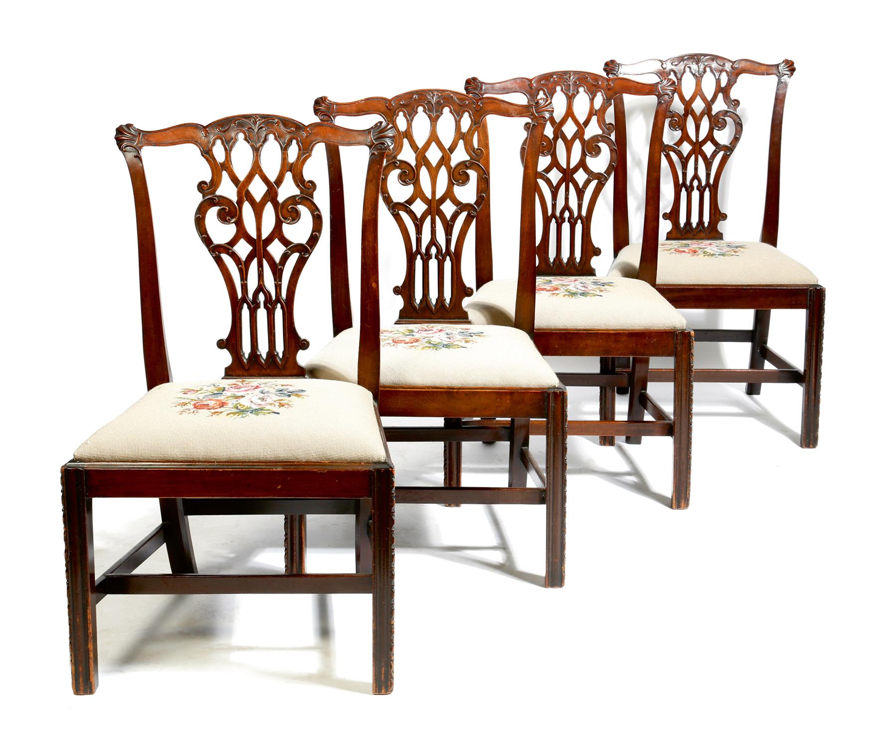A set of four Chippendale style mahogany dining chairs, each with a pierced and scroll carved Gothic splat back, above a needlework drop-in seat, on moulded front legs and 'H' stretchers. (4)