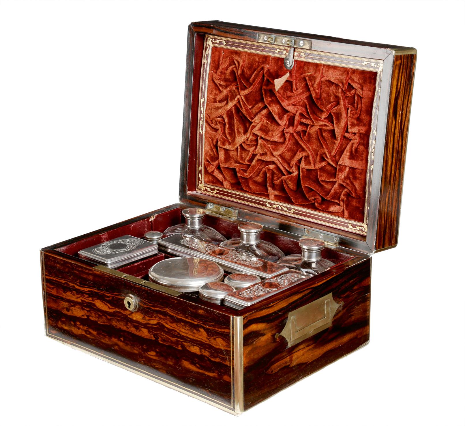 A Victorian coromandel and brass mounted dressing case, the underside of the lid with a letter pouch, above an arrangement of glass jars and bottles with silver plated lids, with a lift-out tray revealing two small jewellery drawers, with a Bramah lock and sunken brass side carrying handles, 14.8cm high, 28.7cm wide, 21.5cm deep.