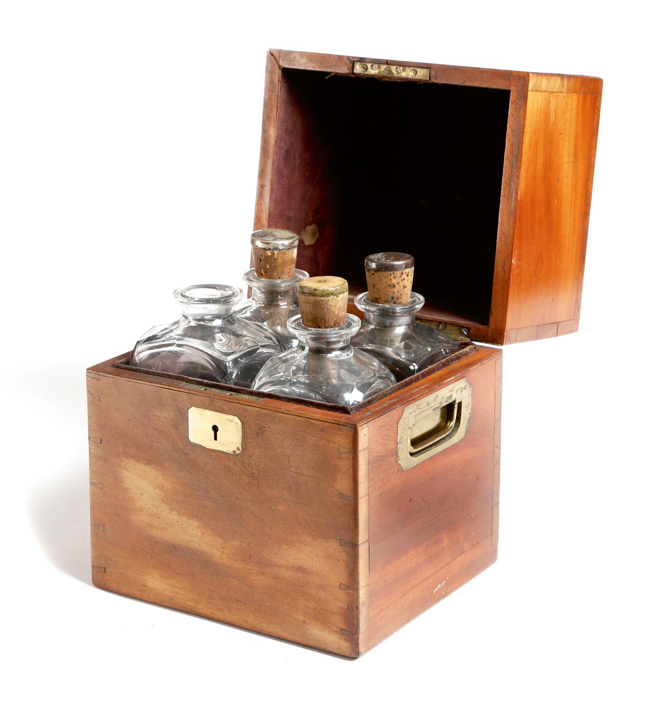 A Victorian mahogany Campaign decanter box, the hinged lid inset with a brass plaque and inscribed 'Major James Duff 23rd Rt Welch Fusiliers', the interior with four glass decanters, two with silver plated lids, with a Hobb's patent lock and sunken brass side carrying handles, 26.6cm high, 20.4cm wide, 17.9cm deep.
