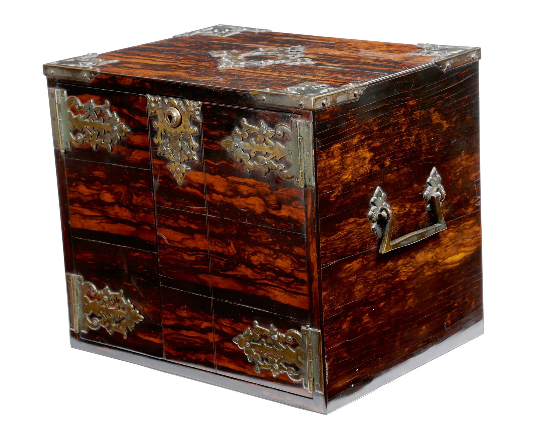 A Victorian coromandel cigar cabinet, with brass strapwork mounts and a Bramah lock, the interior fitted with two drawers, 27.9cm high, 32cm wide, 24.5cm deep.