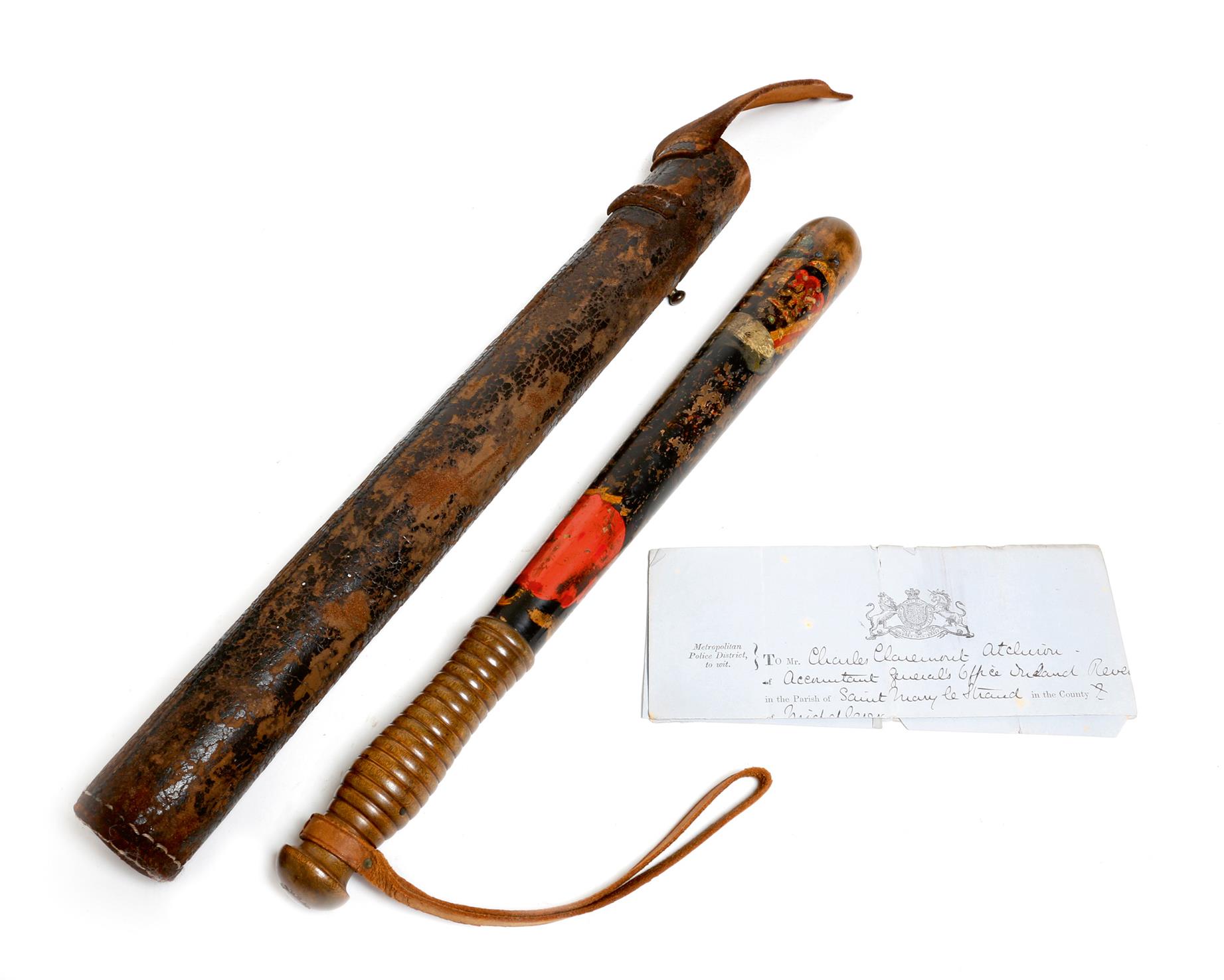 A Victorian painted Special Constable's truncheon, with a ribbed handle, the butt impressed 'FIELD 233 HOLBORN', with a leather strap and a leather spring loaded case, 42cm long, together with the original letter from the Metropolitan Police District appointing Charles Claremont Atclusiou as a Special Constable on the 18th December 1867. (3)