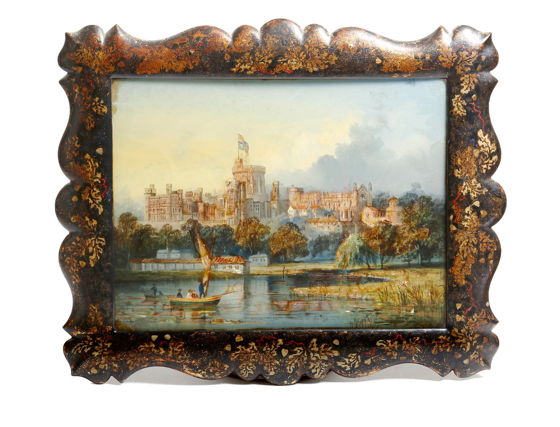 A Victorian reverse glass patent pearl picture of Windsor Castle by Lane of Brimingham, inlaid with mother of pearl, in a papier-mache frame, the verso with a printed paper label inscribed 'LANE'S PATENT', 34.4 x 41.1cm.