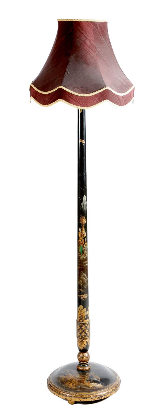 A black japanned standard lamp, decorated in gilt with chinoiserie, with a circular base, early 20th century, fitted for electricity and with shade, 156.5cm high (excluding fitting and shade). (2)