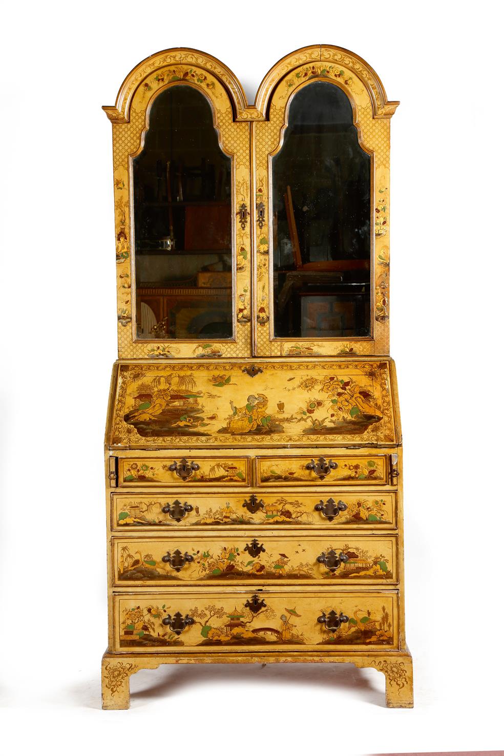 An early 18th century style japanned bureau bookcase, all over decorated with chinoiserie, including figures, flowers, pagodas and boats, all on a yellow ground, the double domed top with a pair of bevelled mirror doors, enclosing two shelves, above a hinged fall, fitted with green painted pigeon holes and drawers, around a central cupboard door with secret pilaster compartments, the base fitted with two short and three long drawers, 205.5cm high, 95cm wide, 52.5cm deep.