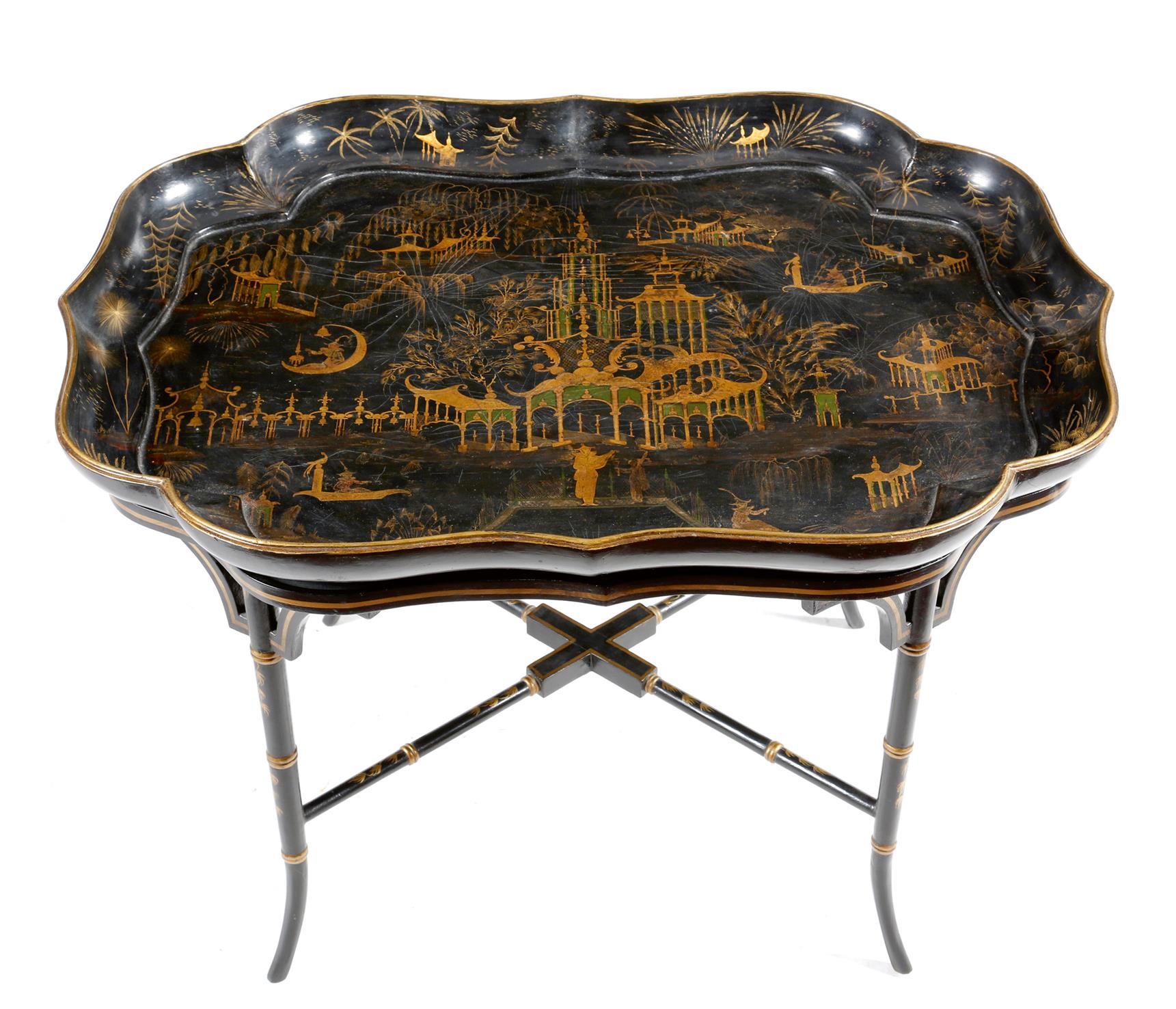 A William IV papier-mâché tray, of serpentine outline, decorated with gilt with chinoiserie scenes, including figures, pagodas, weeping willows and lanterns, on a later stand, 53.2cm high, 80cm wide, 61.3cm deep.