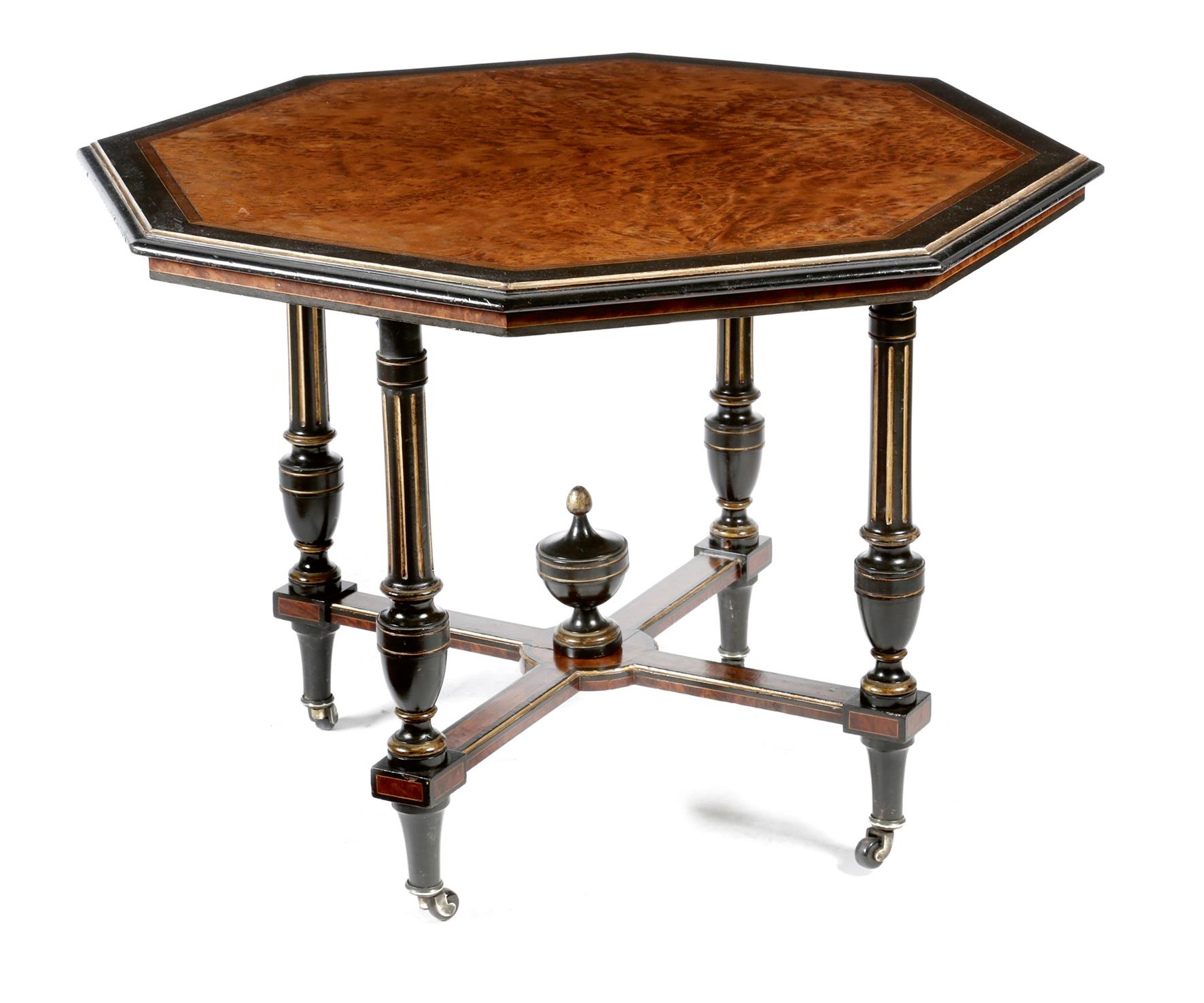 A Victorian Aesthetic movement ebonised and thuya centre table, with parcel gilt decoration, the octagonal banded top on fluted supports united by an 'X' stretcher with an urn finial, the underside stamped '5203', on ceramic castors, 73.1cm high, 105cm wide.
