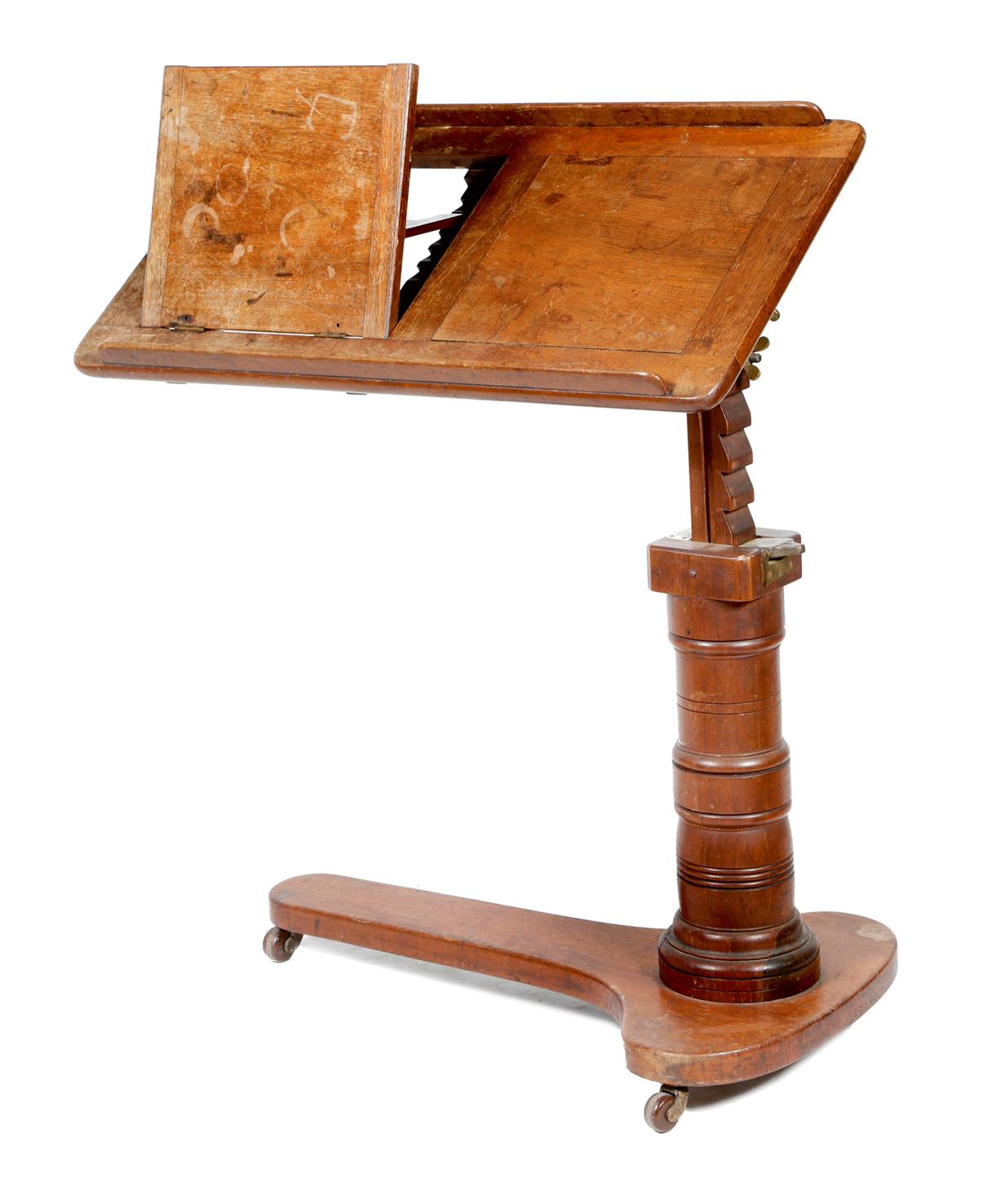 A late Victorian walnut reading table by Leveson & Sons, with an adjustable slope and a ratcheted bookrest, with an applied ivorine plaque inscribed 'LEVESON & SONS, 90 NEW OXFORD ST. W. C. & 21, PARK SIDE, KNIGHTSBRIDGE, LONDON & MANCHESTER, LIVERPOOL, LEEDS', on ceramic castors, 117.8cm high (max), 79.5cm wide, 42cm deep.