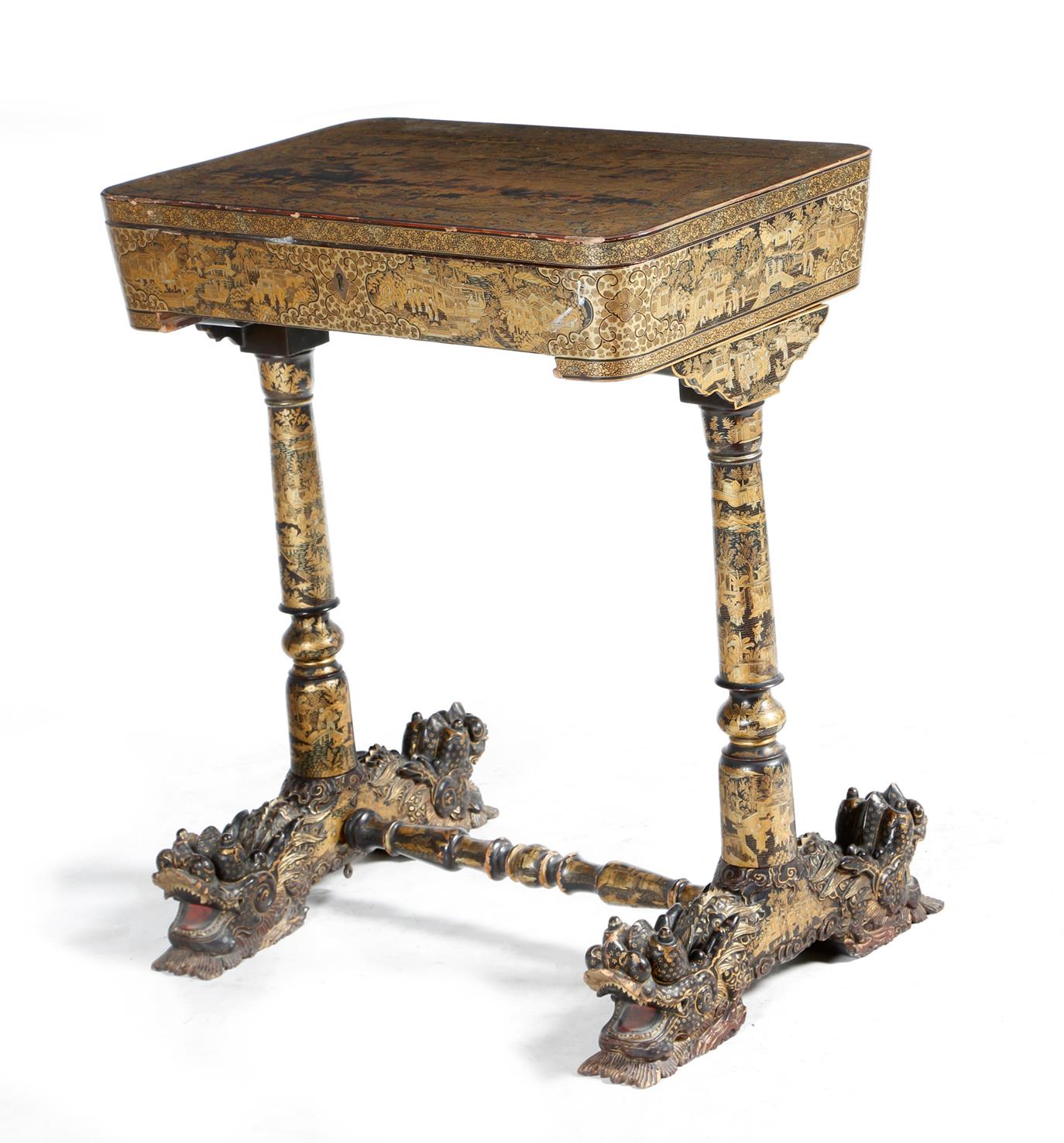 λ A Chinese export black lacquer sewing table, all over decorated in gilt with panels of figures in various pursuits, with pagodas and tress in a watery landscape, with scaley dragon borders, the hinged lid revealing a fitted interior with a lift-out divided tray with a silk pin cushion and various carved ivory utensils and implements including: reel holders, needle cases, clamps a pair of pots and covers, flanked by a pair of lidded compartments fitted with further sewing utensils, originally with a bag, on turned supports united by a stretcher and on dragon's head feet, first half 19th century, 63.5cm wide, 42.4cm deep.
