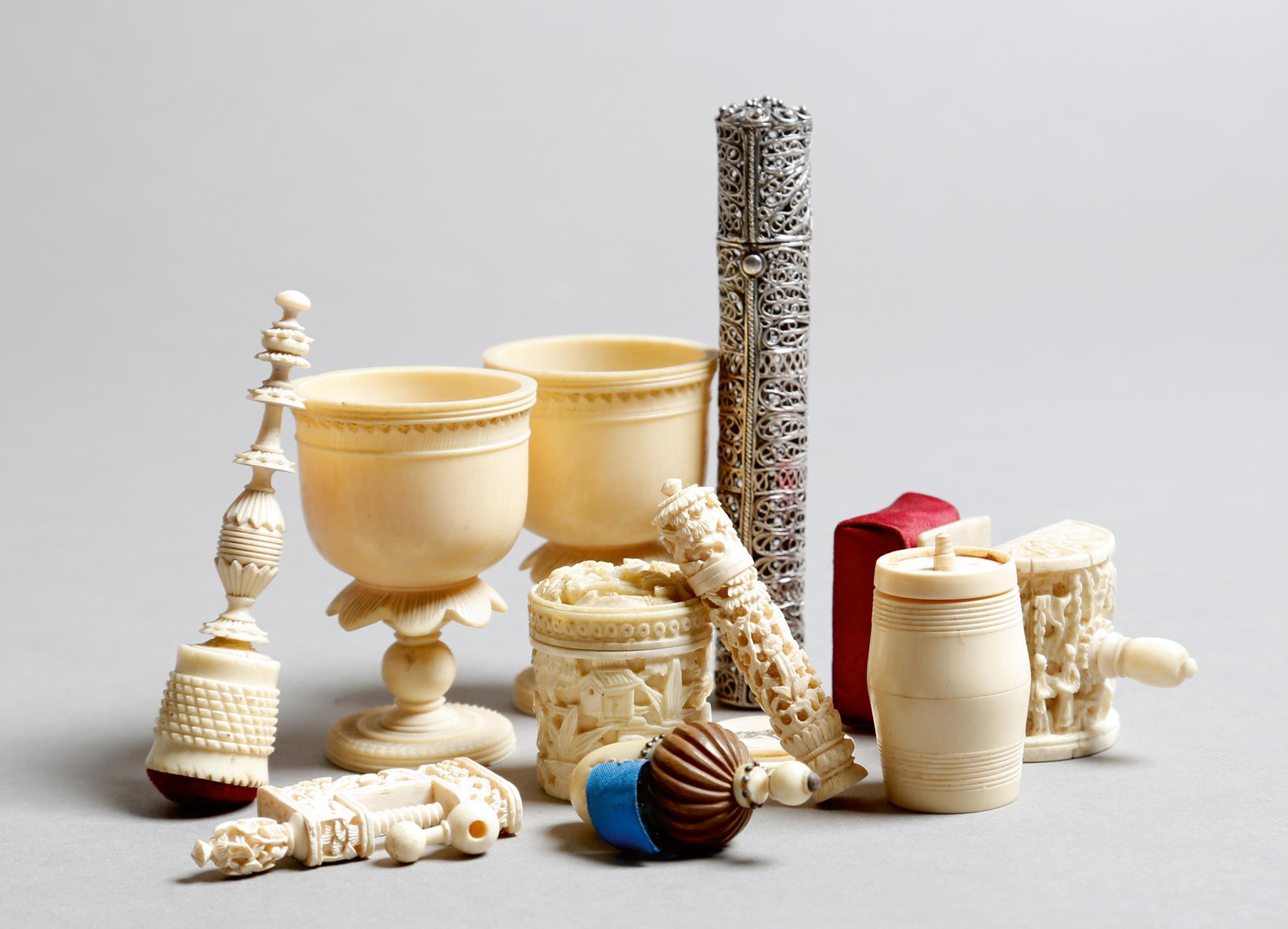 λ A pair of ivory egg cups, with petal collars, together with carved ivory sewing utensils comprising: Chinese clamps, a box and a small needle case; an acorn shape tape measure and a barrel reel holder and a turned pin cushion, together with a continental white metal filigree bodkin / needle case, 19th century, 10.2cm long.