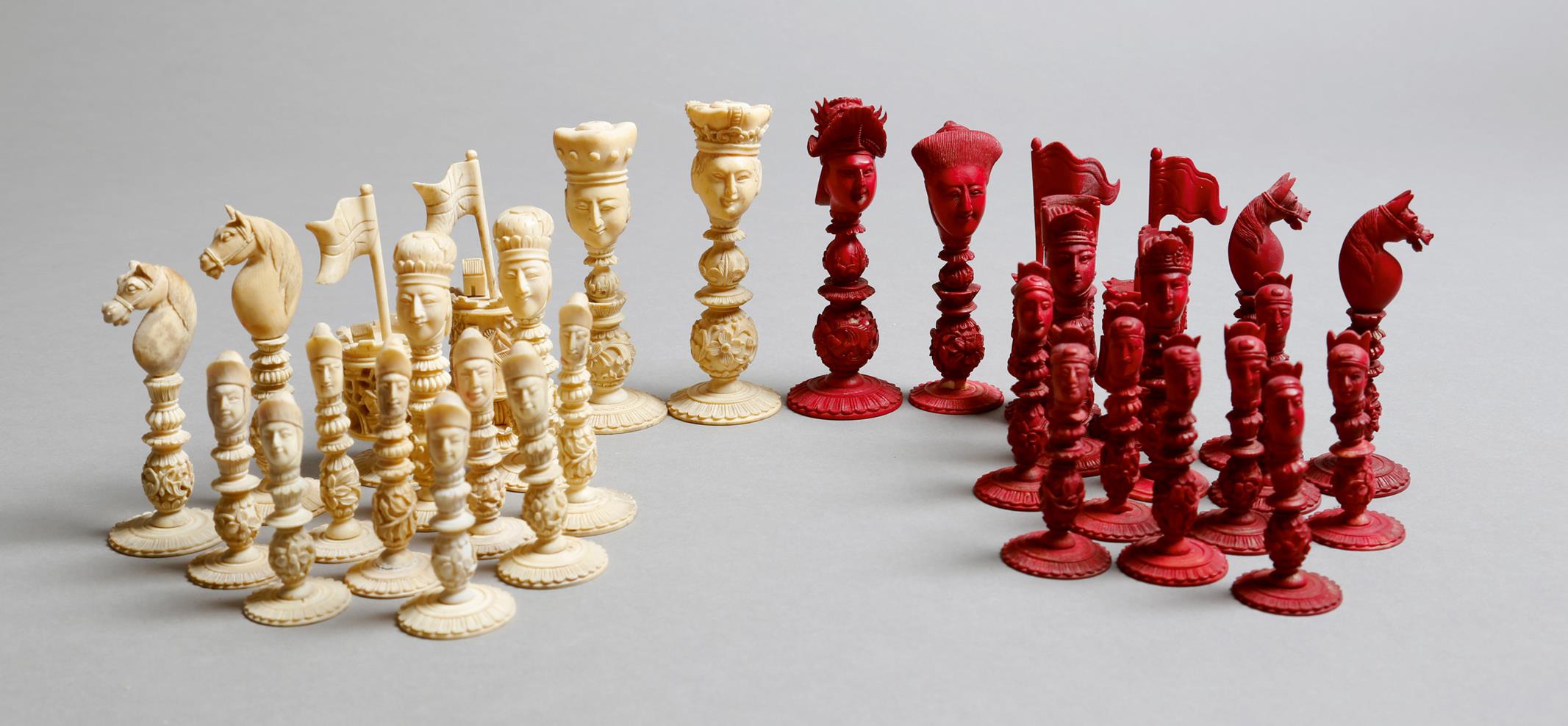 λ A Chinese Macao carved ivory 'bust' chess set, the natural king and queen modelled on George III and Queen Charlotte, the stained red set as the Chinese Emperor and Empress, the bishops as clergy or mandarins, the knights as horses and the rooks as turrets the natural with the union flag, early 19th century, the king: 10.2cm high, the pawn: 5.4cm high. (32)