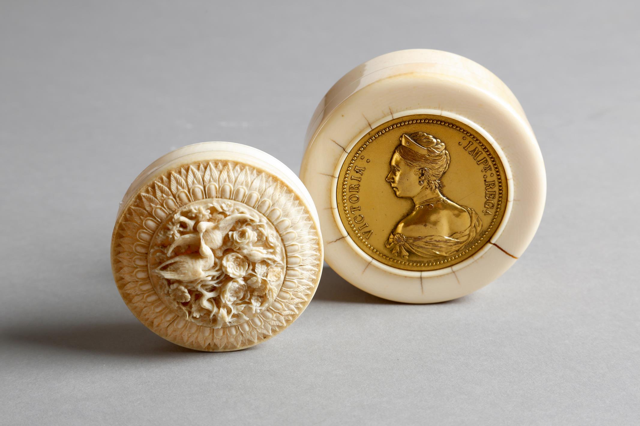 λ A Victorian ivory box, the lid inset with a gilt bronze portrait medallion by Waldemar Uhlmann depicting a relief bust of Princess Victoria inscribed 'UHLMANN AD VIV. SC.', the verso with the conjoined heraldic emblems of the German eagle and the British Royal Standard, signed 'G. LOOS D. BERLIN', together with another ivory box, the cover carved with a bird feedings its young amidst flower and leaves, 8cm diameter (max). (2)