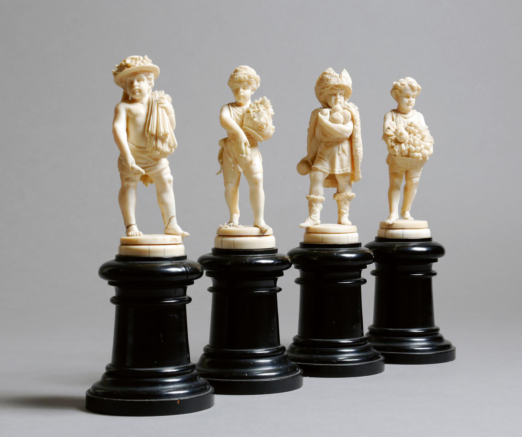 λ A set of four 19th century French Dieppe carved ivory figures, emblematic of the four seasons, modelled as a cherub, winter: wearing a fur coat and holding coals, spring: holding a basket of flowers, summer: with sheaves of wheat and autumn: with a basket of fruit, each mounted on a turned and ebonised socle, 20.9cm high. (4)
