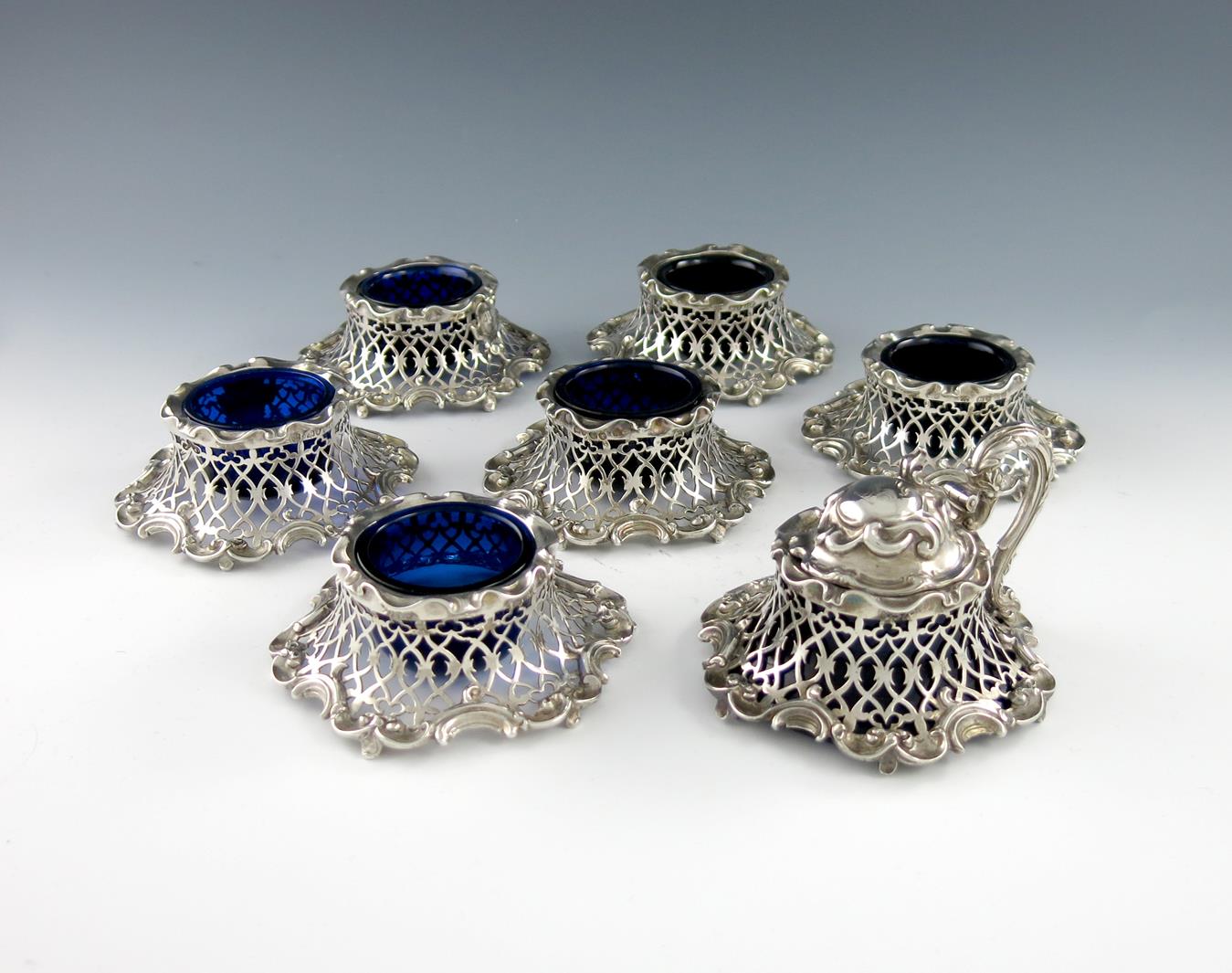 A Victorian silver mustard pot and matched set of six salt cellars,