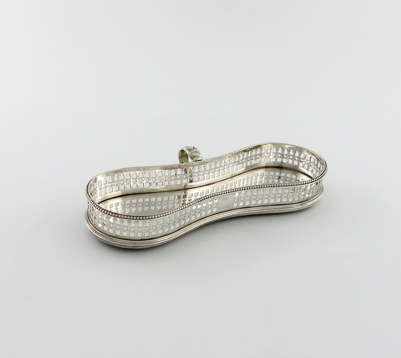 shaped oblong form, with a pierced gallery and beaded border, leaf capped scroll handle, the front with a worn crest, wooden base, length 19.5cm.