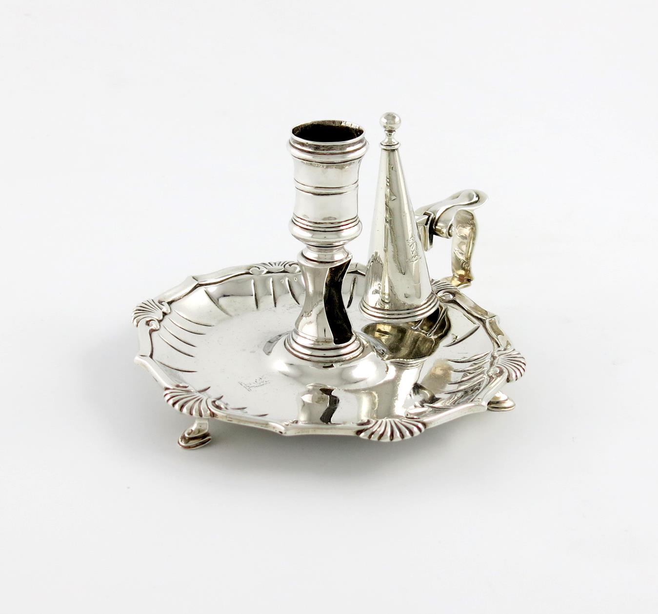 circular form, scroll and shell border, spool shaped capital, engraved with a crest, with a conical snuffer, diameter 13.5cm, approx. weight 9.5oz.