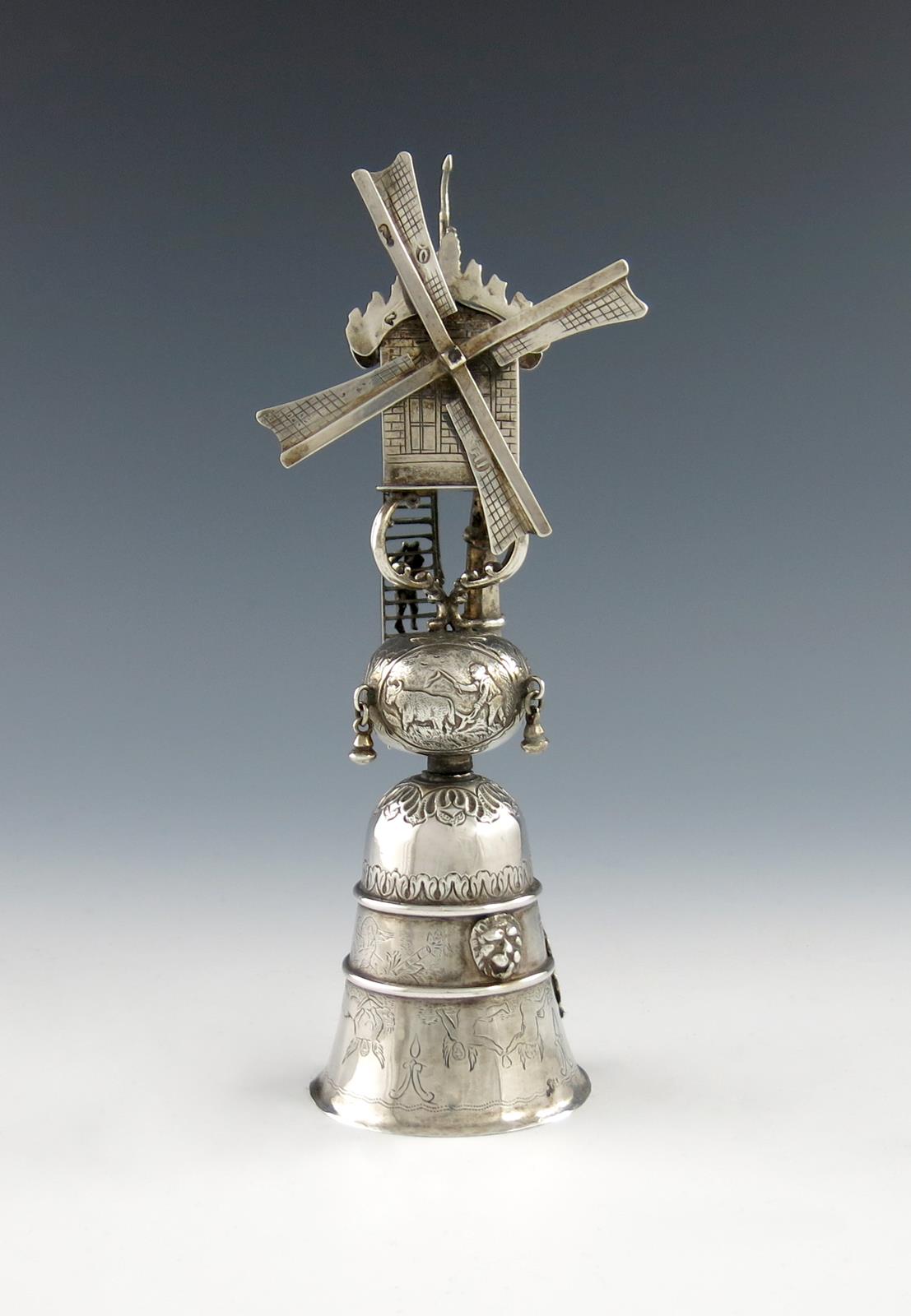in the 17th century manner, tapering bowl engraved with figural scenes, and applied with lion masks and hanging bells, the canopy engraved with figural scenes and with an inscription and clock, height 19.8cm, approx. weight 7.2oz.