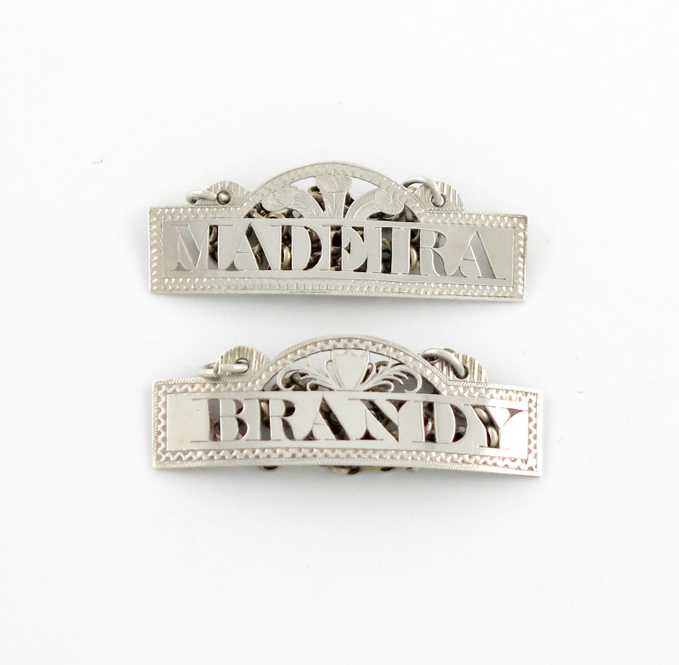 rectangular arched form, pierced 'MADEIRA' and 'BRANDY'. (2)