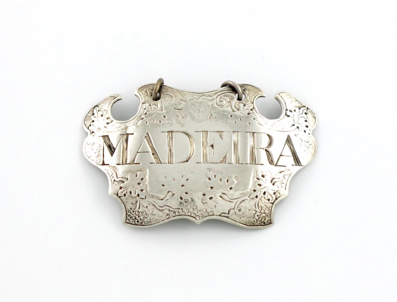 escutcheon form, chased trailing vine decoration, incised 'MADEIRA', length 5cm, approx. weight 0.3oz.