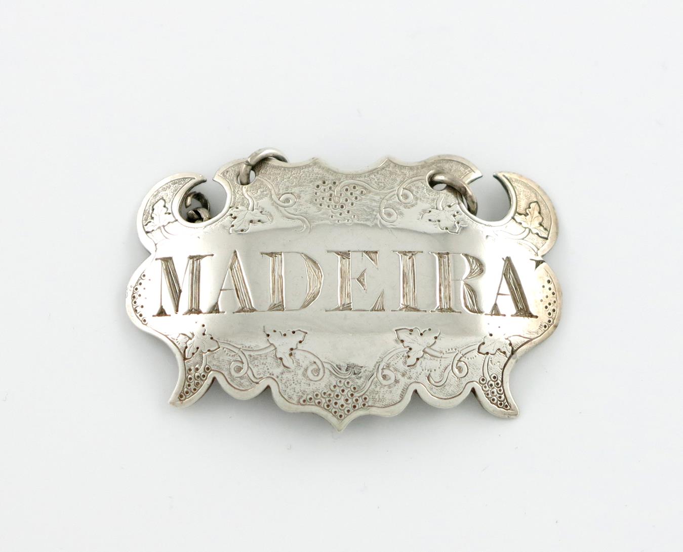 escutcheon form, chased vine decoration, incised 'MADEIRA', length 5.3cm, approx. weight 0.4oz.