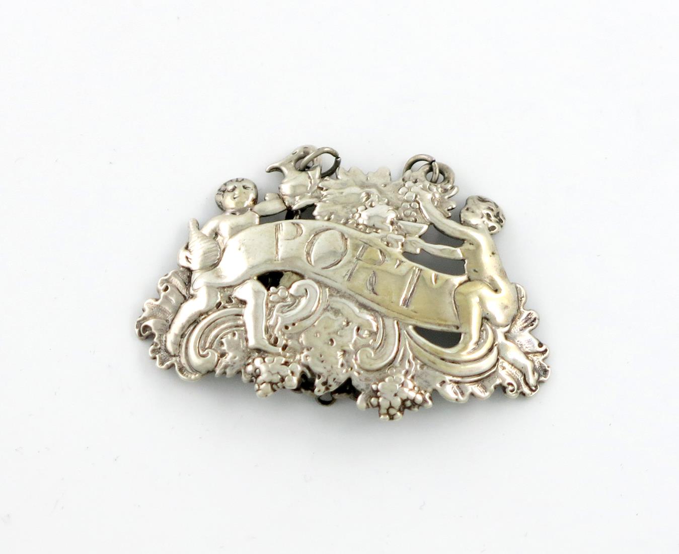 shaped form, with Bacchanalian cherubs with a jug and bottle and trailing grapevines, incised 'PORT', length 6cm, approx. weight 0.5oz.