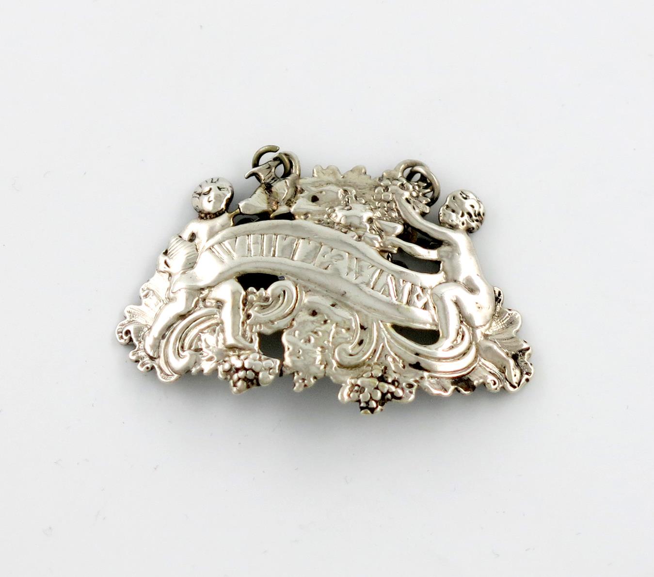 shaped form, with Bacchanalian cherubs with a jug and bottle and trailing grapevines, incised 'WHITE WINE' length 6cm, approx. weight 0.4oz.