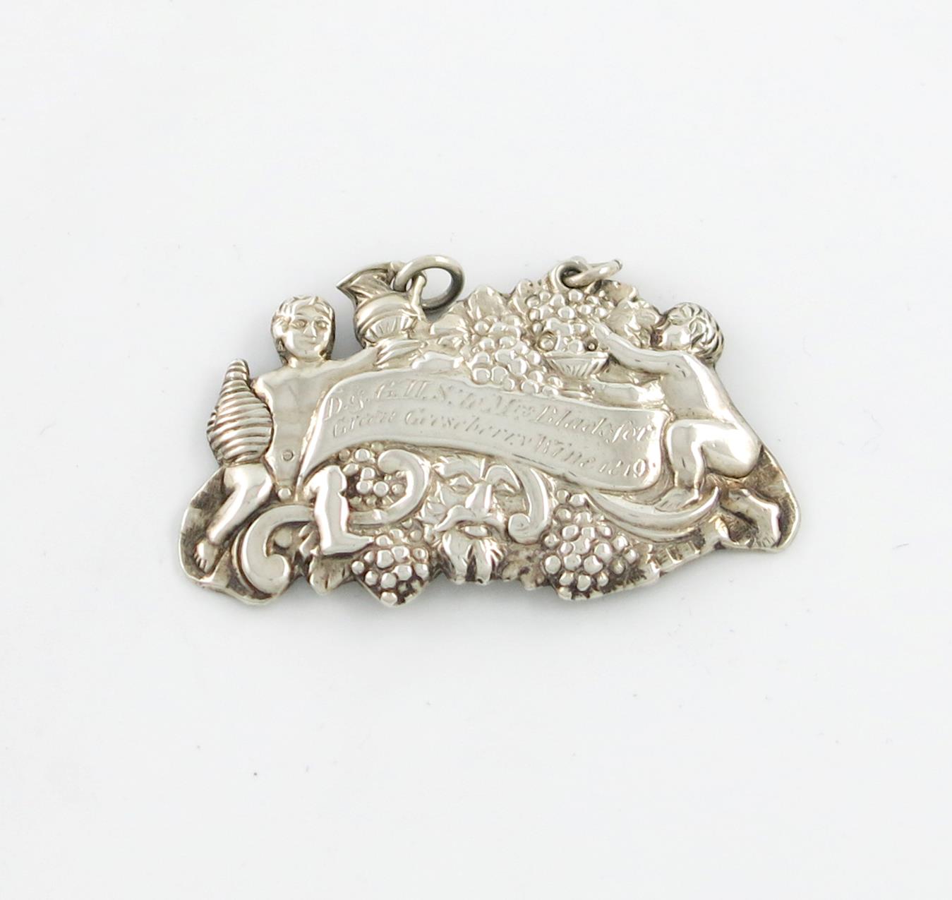 Bacchanalian cherub form, with a goblet and bottle within bunches of grapes, incised 'D and G H.S to Mrs Black for Green Gooseberry wine 1819', length 6cm, approx. weight 0.7oz.