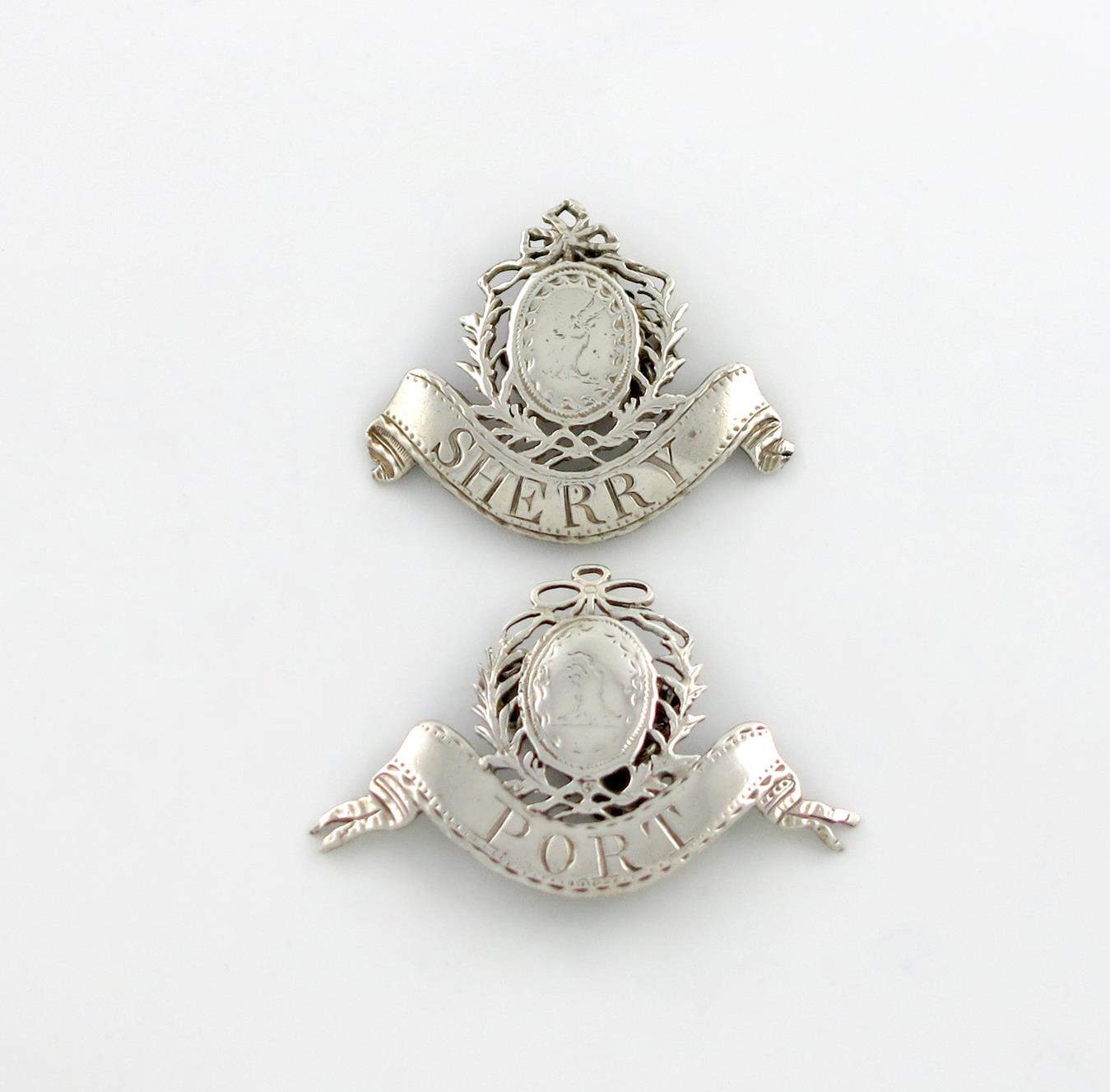 banner form, bright-cut borders, pierced foliate pediment, engraved with two crests, length 6cm and 4.8cm, approx. weight 0.8oz. (2)