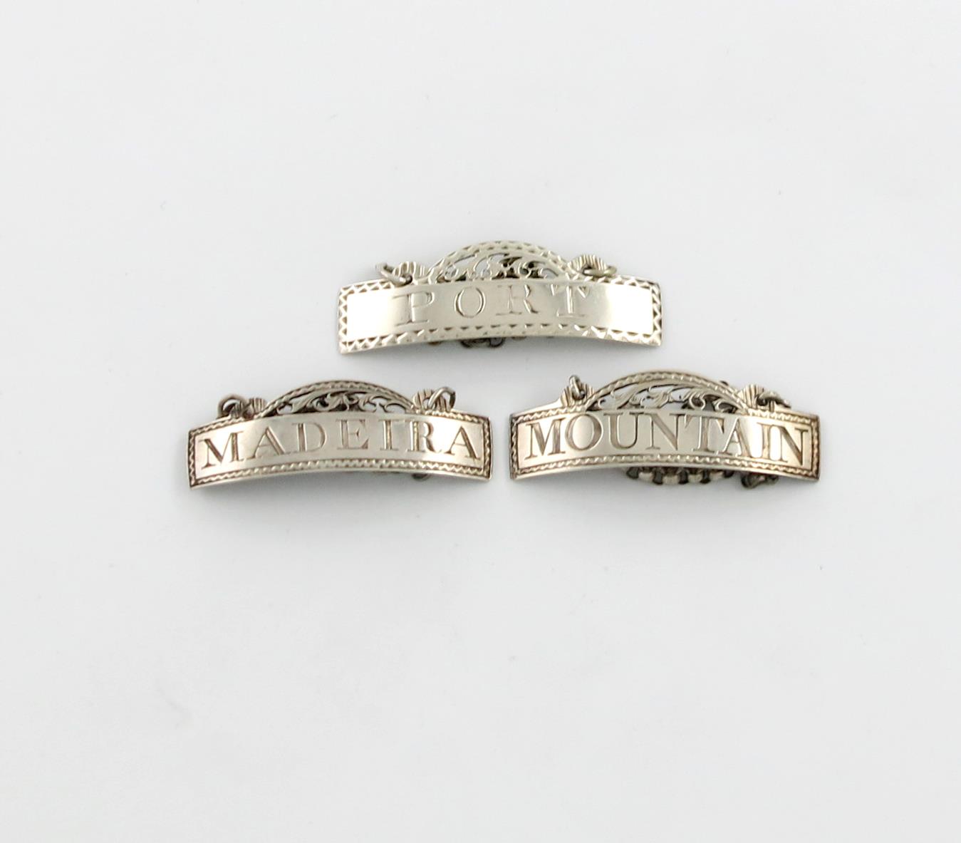 narrow arched rectangular form, pierced decoration, bright-cut borders, incised 'MOUNTAIN', 'MADEIRA', and 'PORT', length 4.4cm, approx. weight 1.2oz. (3)
