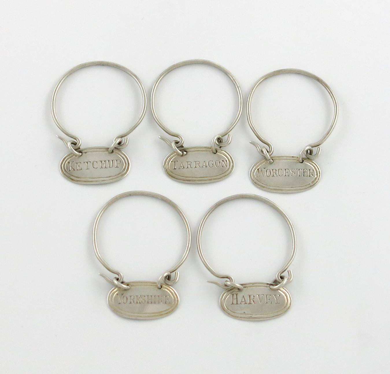 oval form, reeded borders, incised 'YORKSHIRE', 'WORCESTER', 'TARRAGON', 'HARVEY', and 'KETCHUP', length 2.5cm, approx. weight 0.6oz. (5)