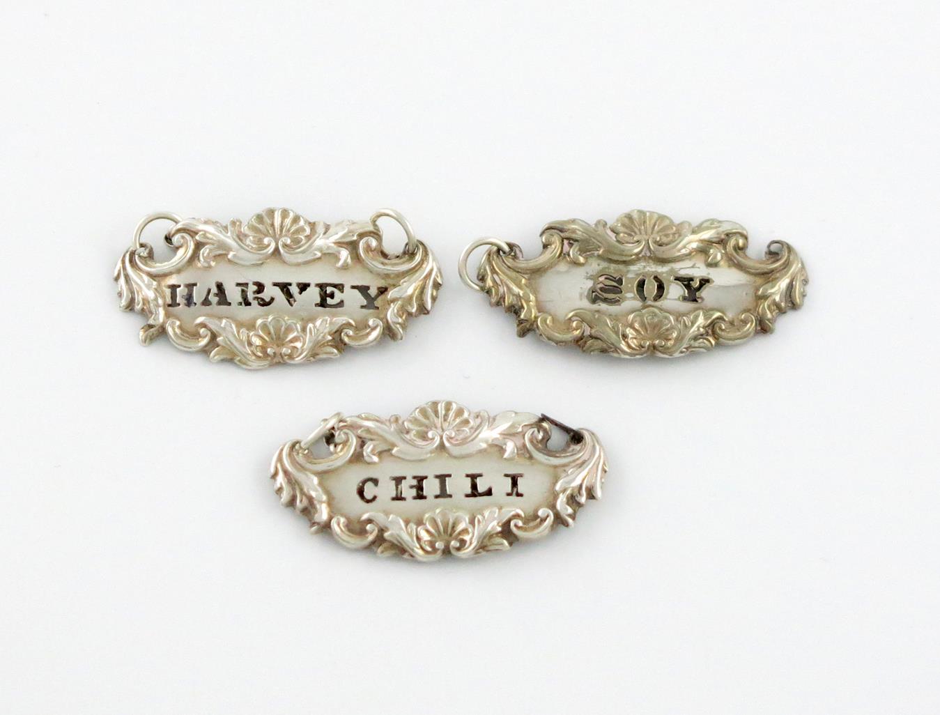shaped oval form, scroll and shell borders, pierced 'HARVEY', 'CHILI' and 'SOY', length 3.8cm. (3)