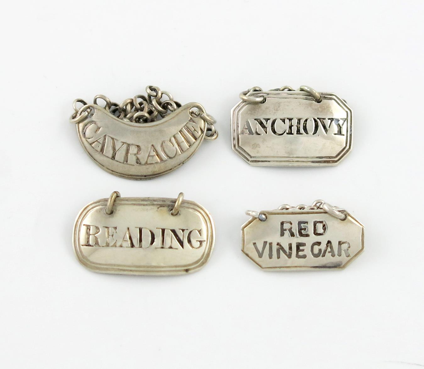 comprising: one of kidney form, incised 'CAYRACHE', one 'RED VINEGAR', one 'ANCHOVY' and one 'READING', approx. weight 0.4oz. (4)