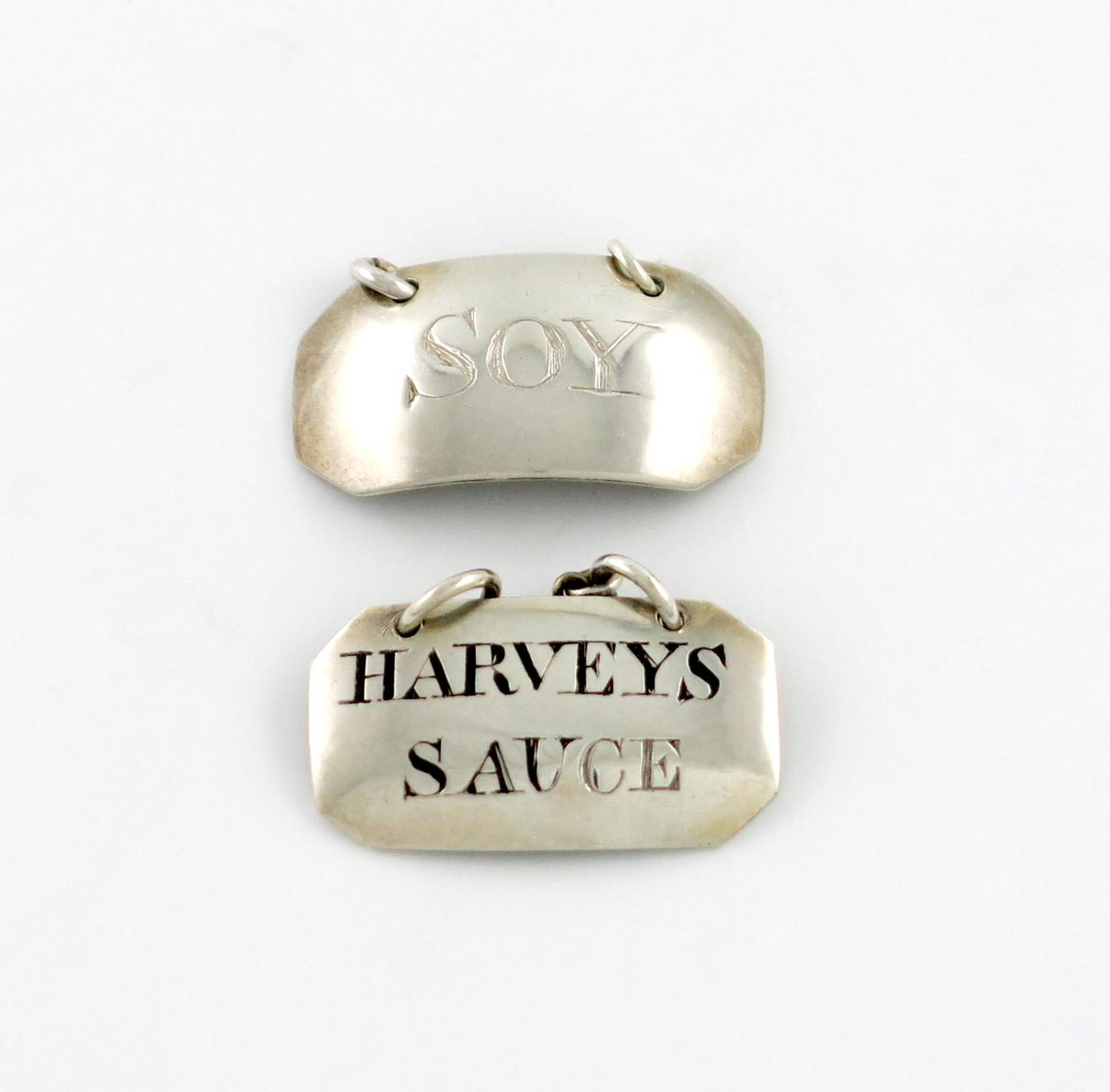 rectangular form, canted corners, incised 'SOY', plus an unmarked label, incised and blackened 'HARVEYS SAUCE', approx. weight 0.2oz. (2)