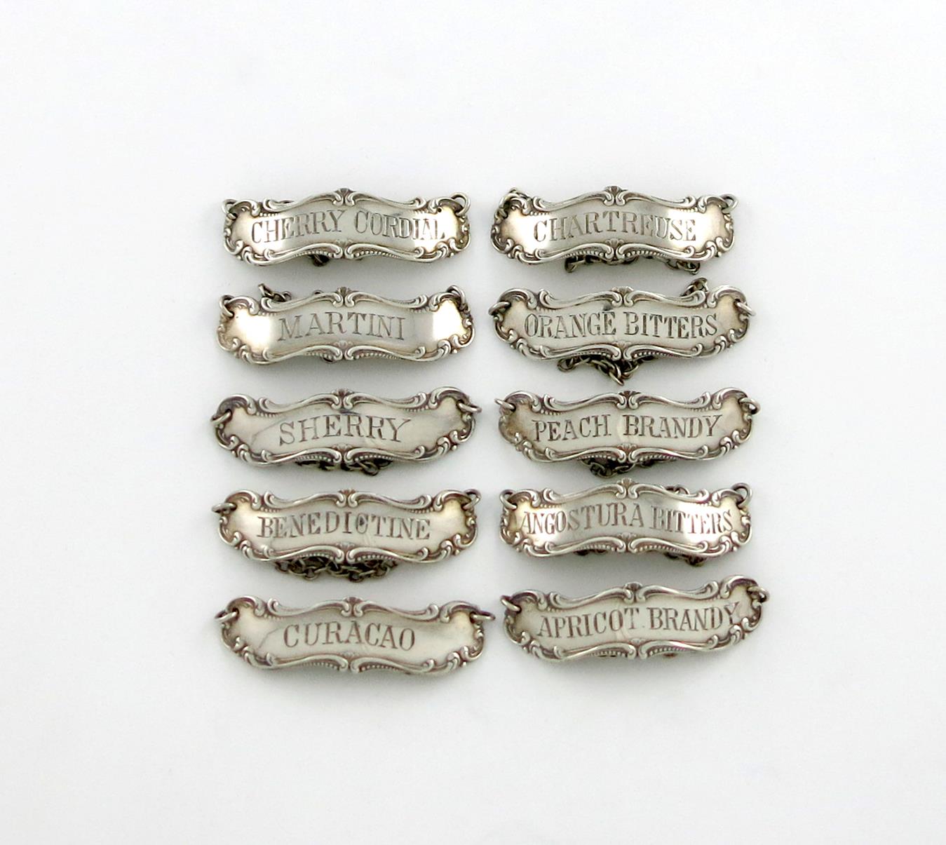 banner form, scroll and bead border, incised 'CHERRY CORDIAL',' PEACH BRANDY', 'ORANGE BITTERS', 'ANGUSTURA BITTERS', 'MARTINI', 'CHARTREUSE', 'BENEDICTINE', 'CURACAO', 'SHERRY' and 'APRICOT BRANDY', length 4.8cm. (10)