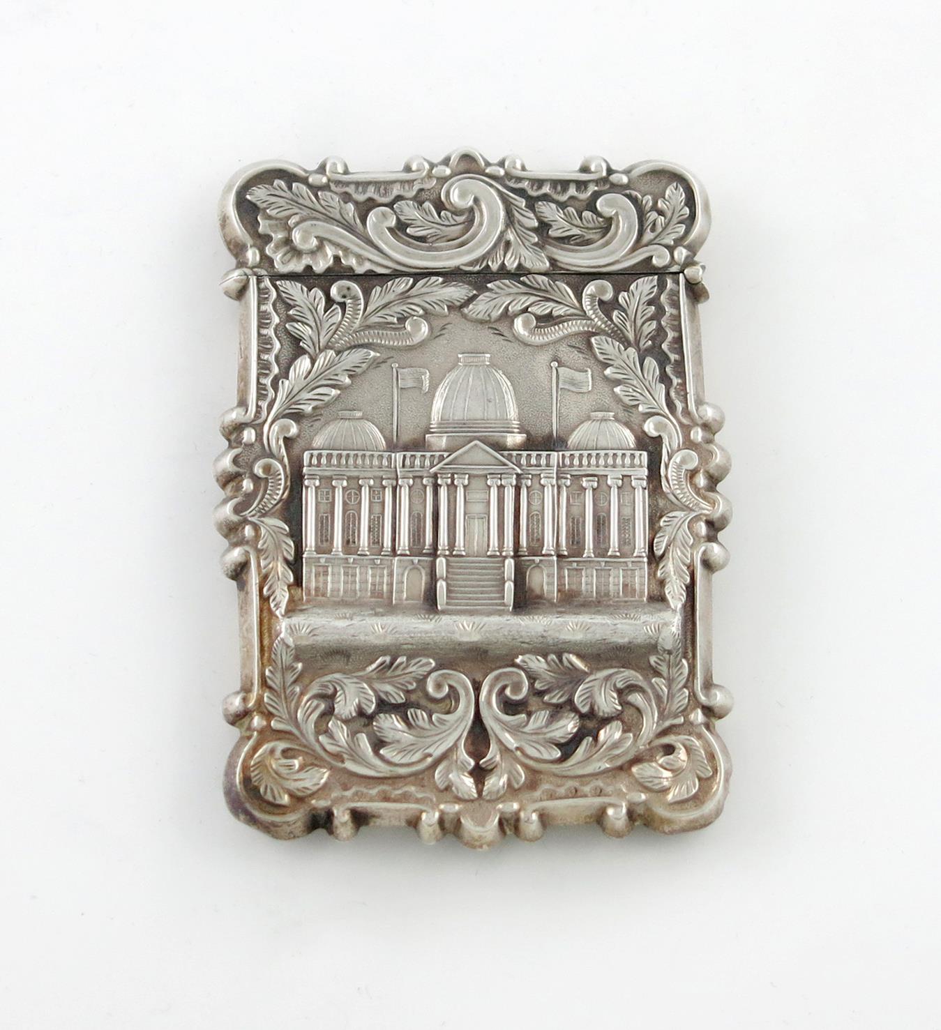 rectangular form, scroll borders, the front with an embossed scene of the Capitol, foliate scroll decoration, the reverse with similar decoration and inscribed 'VICTORINE', length 9cm, approx. weight 1.5oz.