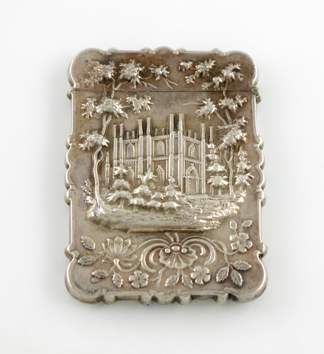 rectangular form, scroll borders, the front with an embossed scene of an unidentified building, foliate scroll decoration, the reverse with similar decoration and with a vacant cartouche, length 9cm, approx. weight 1.5oz.