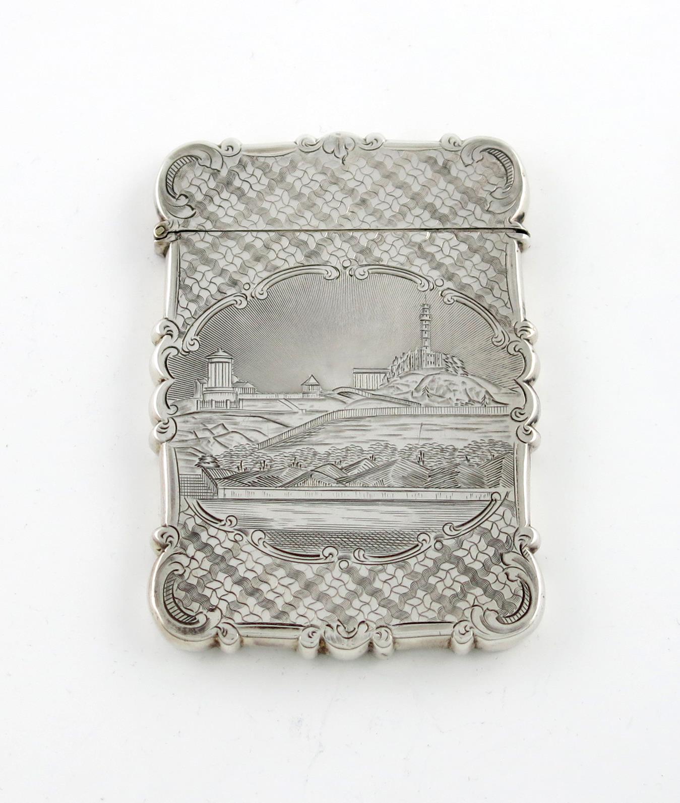 A Victorian silver engraved 'castle-top' card case, Calton Hill, Edinburgh,