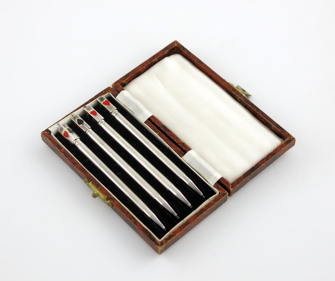 engine-turned decoration, the finials enamelled with the four playing card suits, in a fitted case. (4)