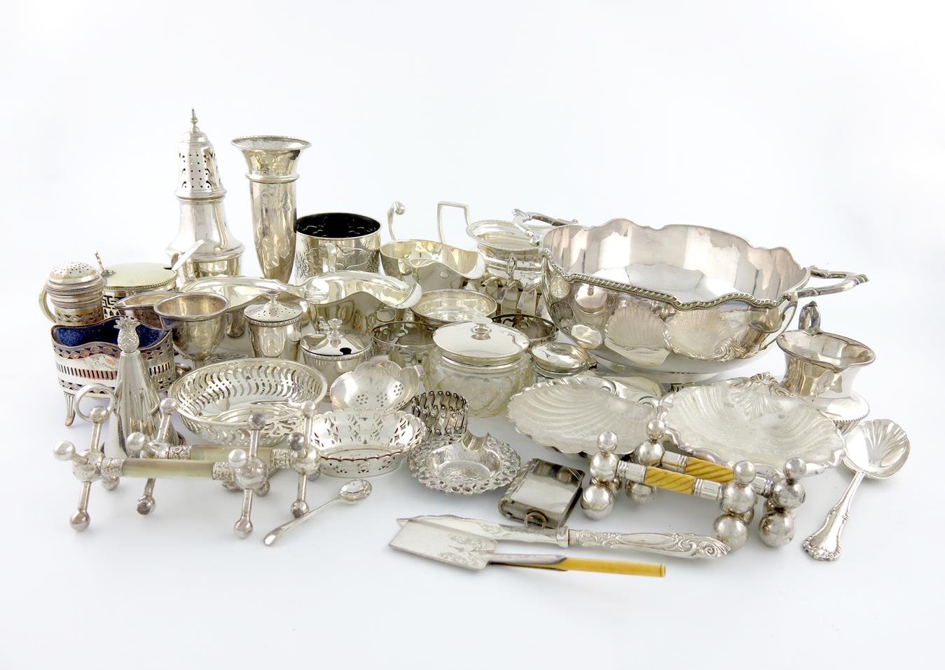 comprising silver items: a pair of sauce boats, Sheffield 1937, a sugar caster, a vase, a pot with cherub decoration, by William Comyns, London 1899, a toast rack, a tea strainer and matched stand, a mustard pot, a pepper pot, two egg cups, (one a.f), three dishes and other items, plus a small quantity of electroplated items including a two-handled bowl, two butter dishes and two jugs, approx. weighable 28oz. (qty)