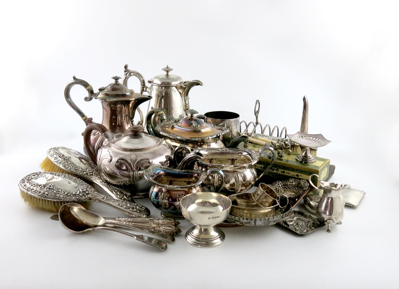 comprising silver items: a travelling chalice, Sheffield 1934, a circular dish, a Chinese ashtray, a cigarette case, a cream jug, four brushes, two dishes, a spoon, two napkin rings, a tobacco box, and six silver-handled cake knives, plus electroplated items, a four-piece tea set, a teapot, a hot water pot, a toast rack, a wine funnel and other items, approx. weighable 19.5oz. (qty)