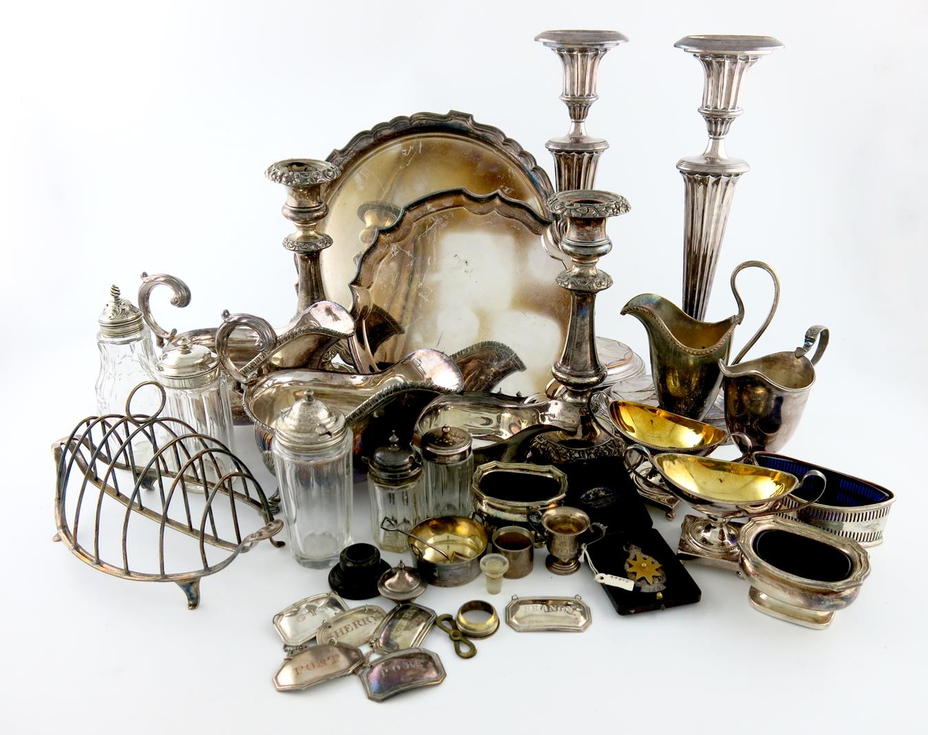 comprising silver items: a sauce boat, by E. Viner, Sheffield 1936, oval form, with a carved ivory handle, plus two silver-mounted condiment bottles, a miniature cup, a badge, a modern wine label, plus old Sheffield plated and electroplated items: two pairs of candlesticks, a pair of sauce boats, a toast rack, two salvers, a cream jug, two pairs of salt cellars, a single tub salt cellar and other items, approx. weighable 4oz. (qty)