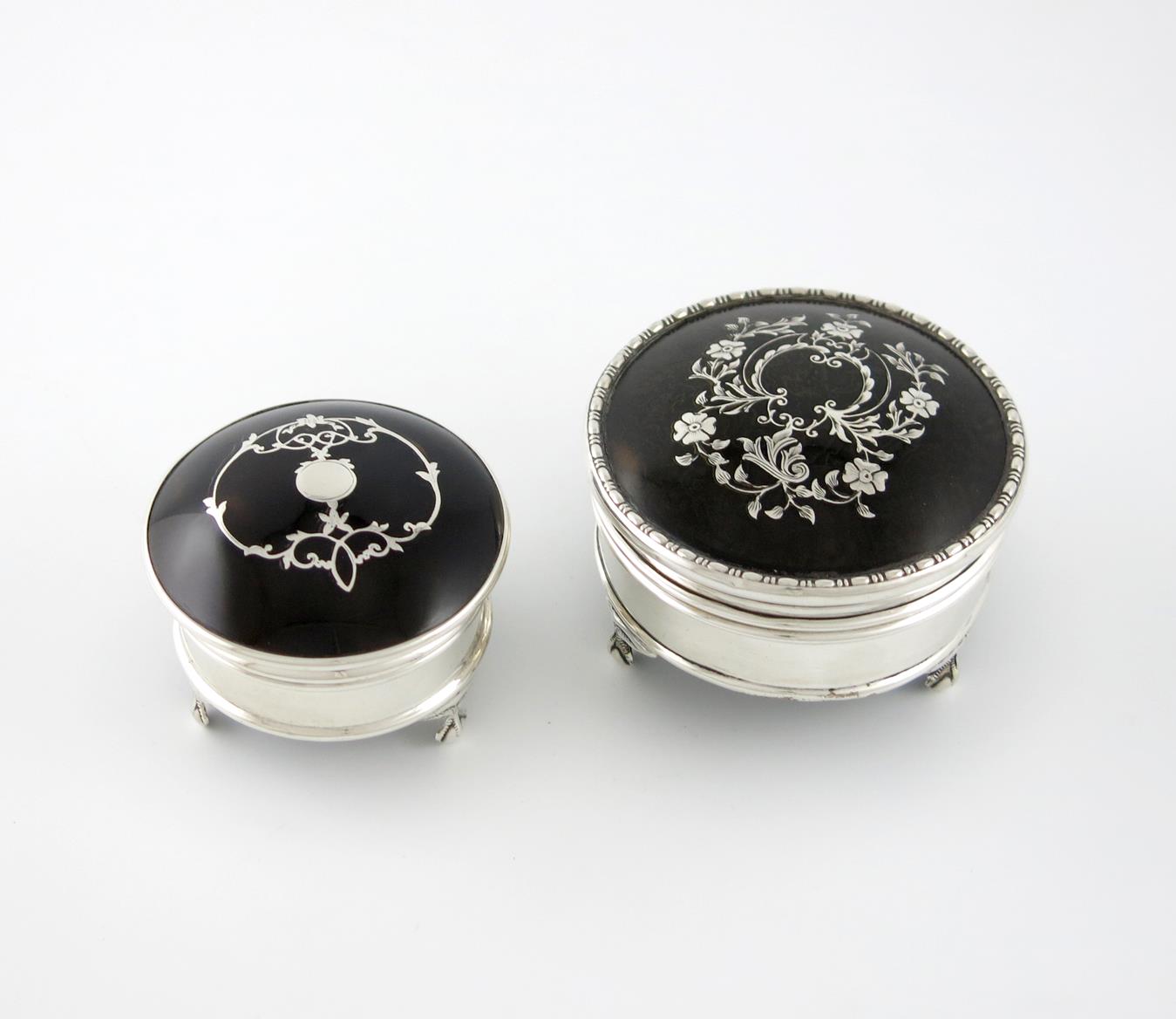 circular form, the hinged cover with inlaid decoration, husk border, on three scroll legs, plus another silver-mounted tortoiseshell dressing table box, by the same maker, Birmingham 1919, circular form, inlaid cover, on four scroll legs. (2)