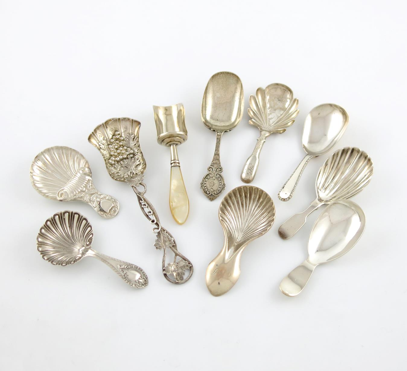 various designs, comprising: one by George Unite, Birmingham 1863, engraved decoration, one by Hilliard and Thomason, Birmingham 1859, foliate shovel bowl, long pierced foliate handle, one of shovel form, with a mother-of-pearl handle, and various others, approx. total weight 3.8oz. (10)