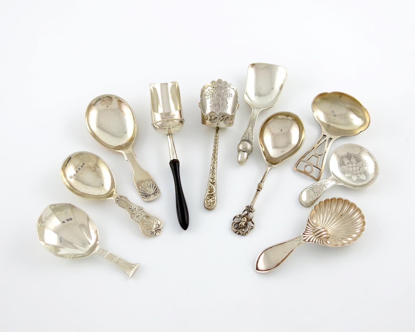 various designs, comprising: one with a handle, pierced with a stylised figure, by Lanson Limited, Birmingham 1942, two of shovel form, one with an acorn finial, and various others, approx. total weight 5oz. (10)