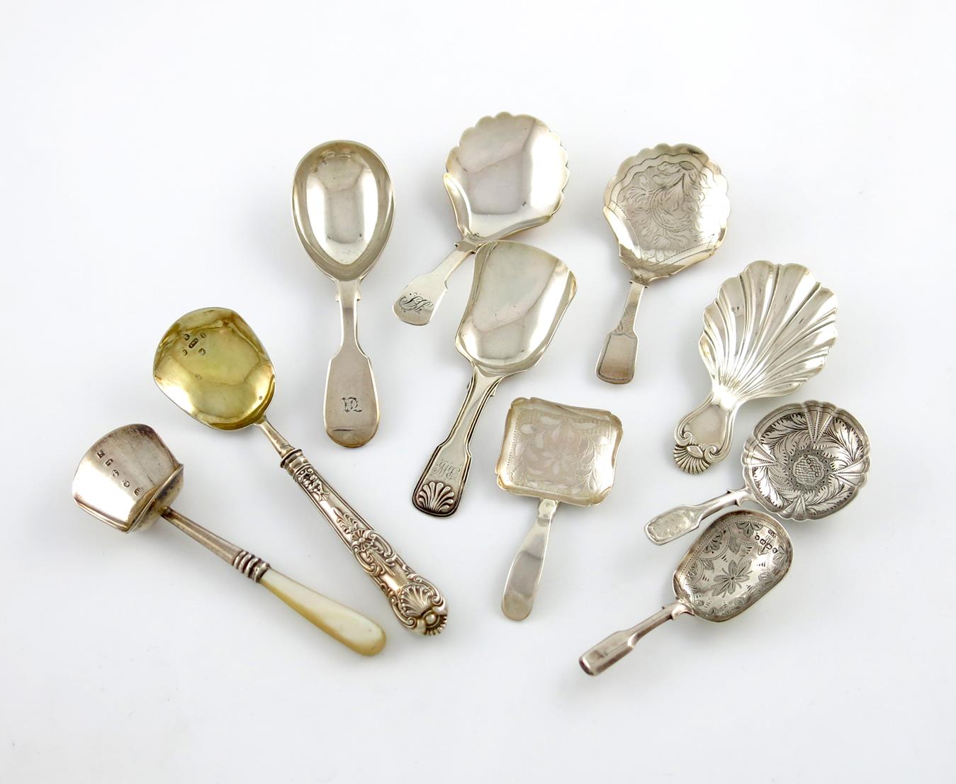 various designs, comprising: a William IV one by Unite & Hilliard, Birmingham 1830, shaped rectangular bowl, engraved decoration, plus a Fiddle Thread and Shell example by George Unite, and various others, approx. total weight 4oz. (10)