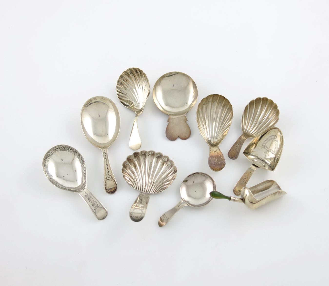 various designs, comprising: one of shovel form, by Cocks and Bettridge, Birmingham 1801, shovel form, turned stained baluster green ivory handle, one by Samuel Pemberton, and various others, approx. total weight 2.8oz. (10)