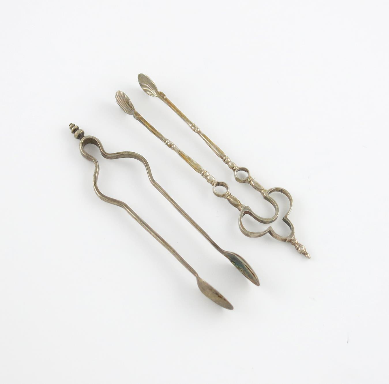 the oval bowls with plain rat-tails, the arm initialled, length 12.8cm, plus an unmarked pair of Andiron sugar tongs, approx. weight 1.3oz. (2)