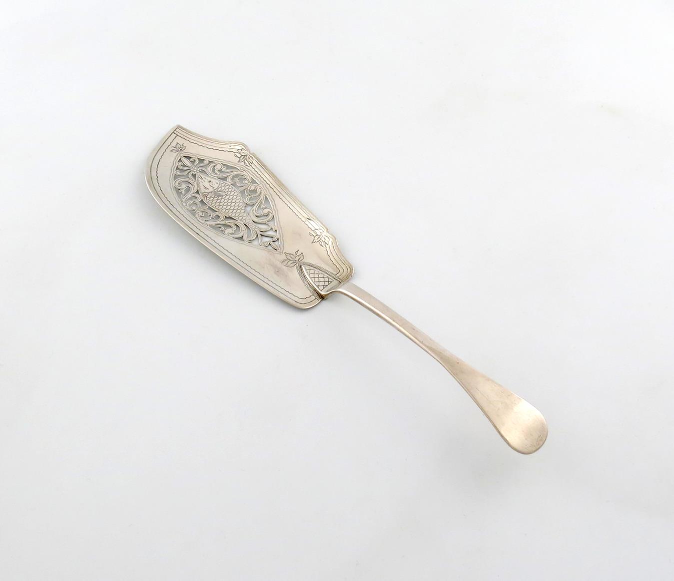 the blade pierced and engraved with a fish within foliate scrolls, engraved borders, length 31cm, approx. weight 3.7oz.
