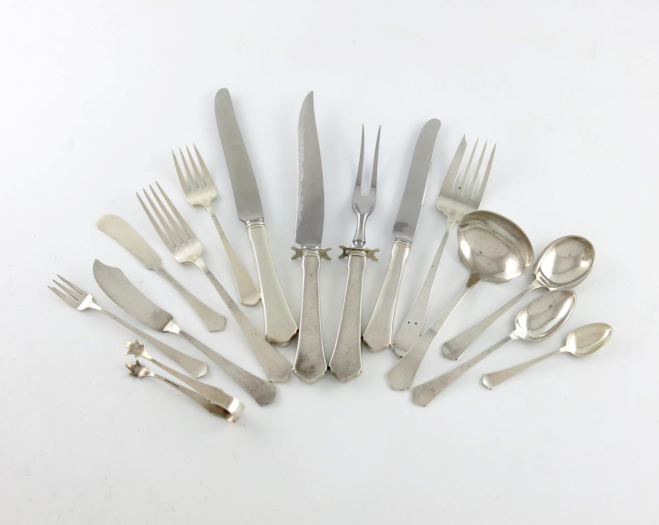 comprising: twelve table forks, twelve dessert forks, ten salad/small fish forks, twelve table knives, twelve dessert knives, twelve large teaspoons/small dessert spoons, twelve oyster forks, ten individual butter knives, ten coffee spoons, a carving knife and fork, a ladle, a pair of sugar tongs, a sugar spoon and a butter knife, approx. weighable 90oz. (qty)